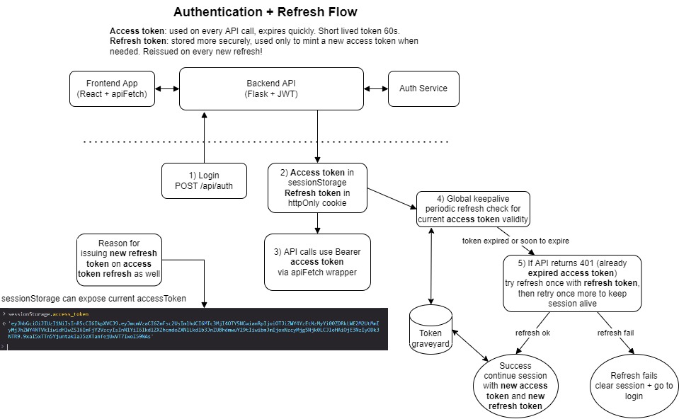 My first implementation tied the refresh interval to a specific route. It worked beautifully while sitting on that page. The moment navigation changed and user left elsewhere, the token checks stopped silently. Tokens expired, which had cascading effecst: sessionStorage cleared and user forced to logout. Its not that dangerous to speak, the user could get a new access token reissued if their refresh token were still valid. But that could never happen because of the point above and even if that was sorted, a new refresh token should also be issued (and the old one revoked) with every refresh request.
